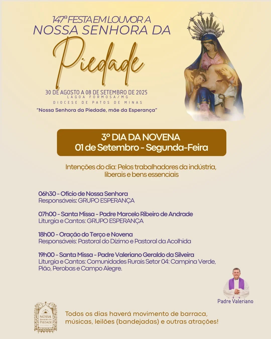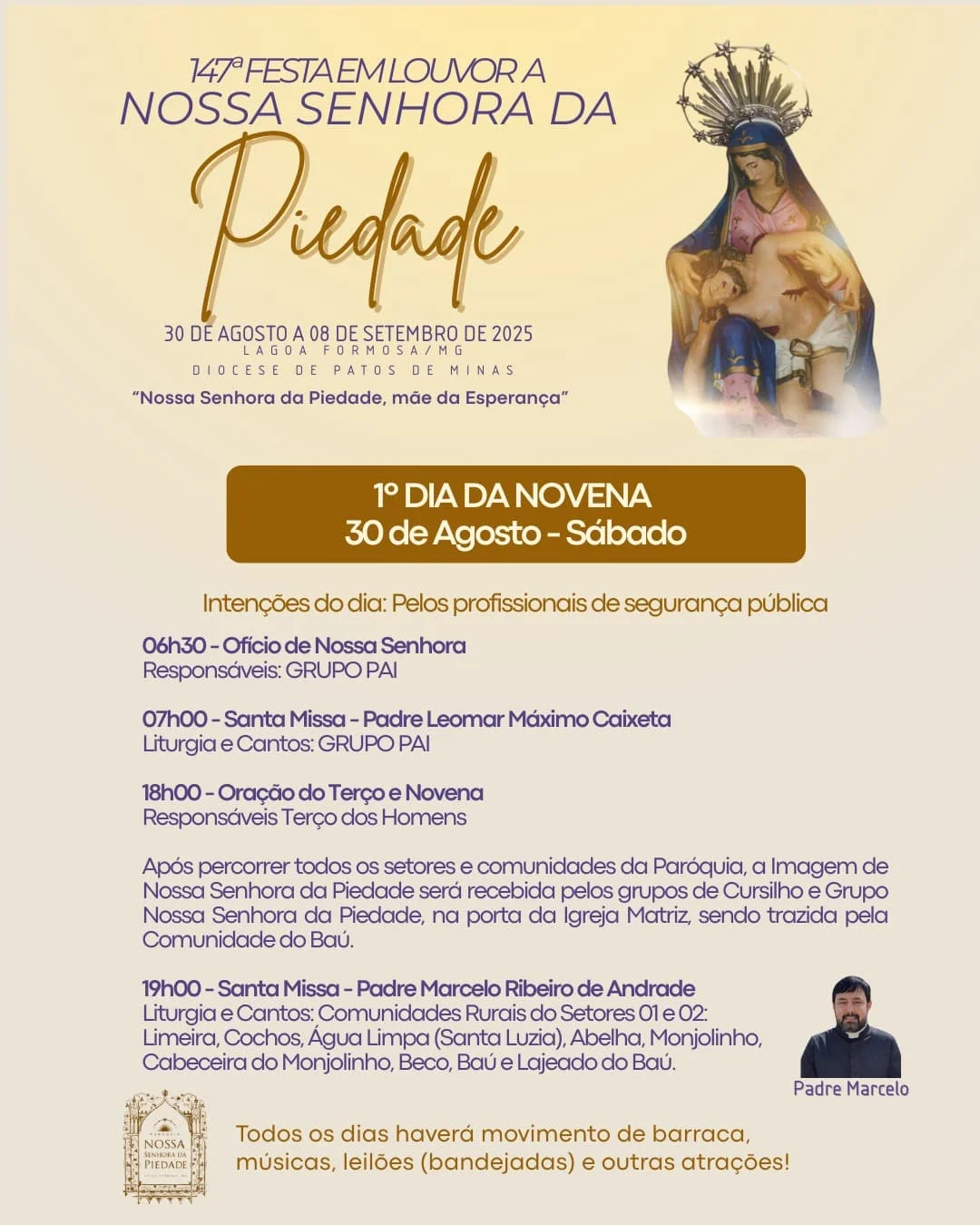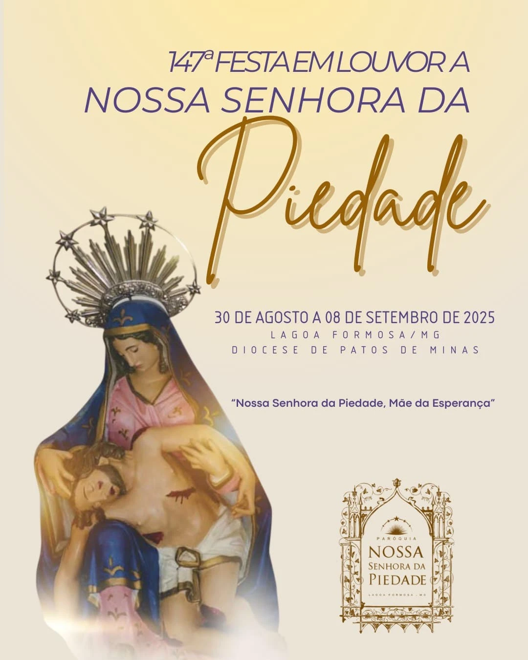 Começa neste sábado (30) mais uma festa religiosa que reúne fé e tradição: a 147ª festa de Nossa Senhora da Piedade, em Lagoa Formosa. A programação segue até o dia 08 de setembro com novena, missas, movimentação de barraquinhas, leilões, show de prêmios e muito mais.