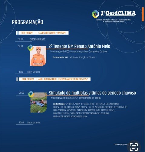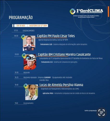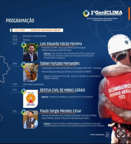 A programação reúne nomes como Sidney Furtado Fernandes, coordenador da Rede de Resiliência das Nações Unidas, que apresenta iniciativas globais para capacitação de órgãos de resposta, e o prefeito de Patos de Minas e presidente da Assossiação Mineira dos Municípios (AMM), Luís Eduardo Falcão, que compartilha as experiências do município na gestão de riscos. Também participa o professor doutor Adalberto Vieira, da Universidade Federal de Viçosa, trazendo análises climáticas e previsões para o fim de 2025, com enfoque no impacto ao agronegócio.