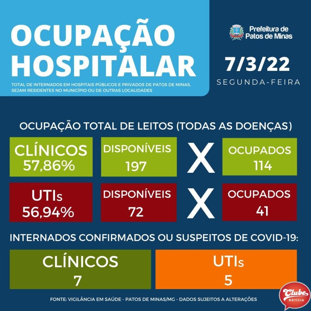 Em relação às internações, o boletim registrou 12 pessoas internadas, sendo sete pacientes internados em leitos clínicos e cinco pacientes em leitos de UTIs, esses números consideram pacientes residentes em Patos de Minas e também pacientes de outros municípios internados na cidade, considerando leitos públicos e privados.