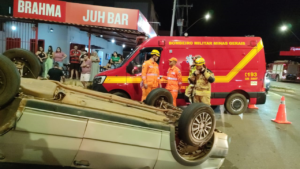 De acordo com informações da Polícia Militar, o veículo Fiat Uno seguia pela Rua Jaime Ramos quando, ao passar pelo cruzamento, foi atingido por uma motocicleta que trafegava pela Rua Major Gote. Com o impacto, o carro rodou na pista e acabou capotando, ficando com as rodas para cima.