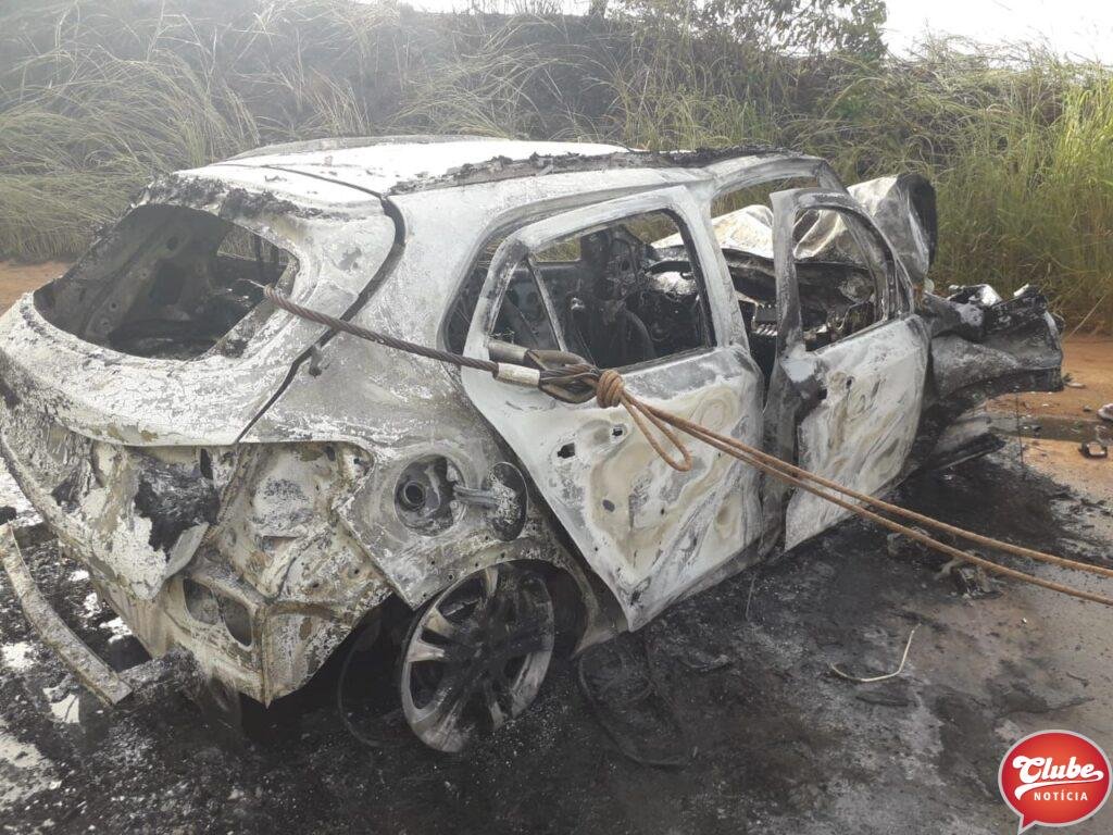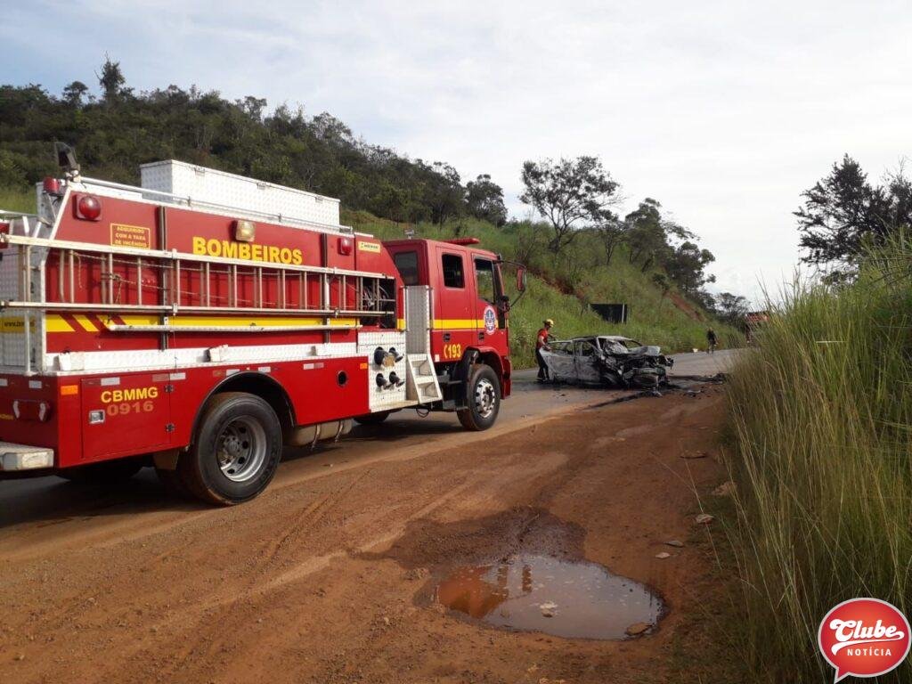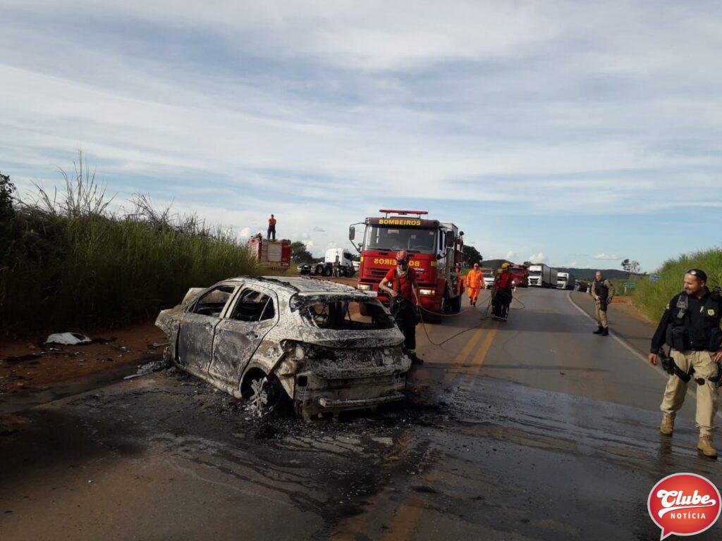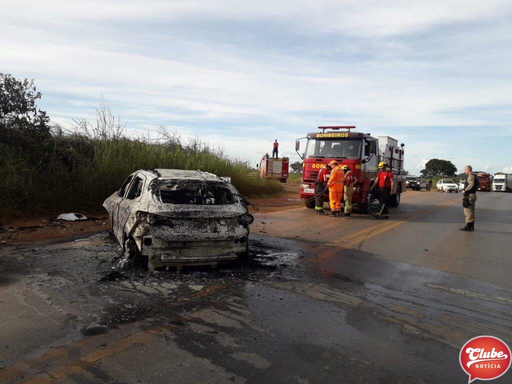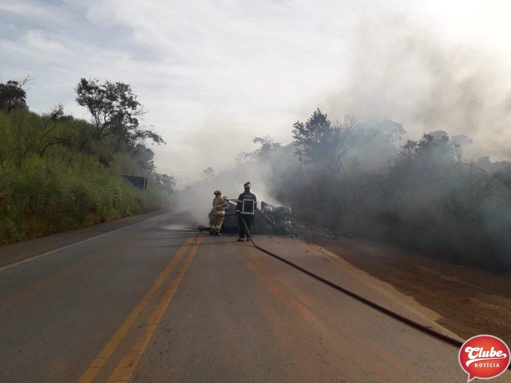 Um carro pegou fogo após bater contra um cavalo mecânico no km 363 da BR-365, próximo à Varjao de Minas. A batida foi na tarde deste sábado (18/03). O casal que estava no carro ficou ferido.