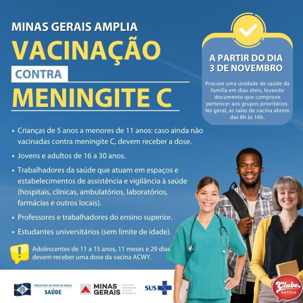 Começou nesta quinta-feira (03/11), em Minas Gerais, a ampliação do público-alvo para imunização com a vacina Meningocócica C. Podem ser vacinados contra a meningite jovens de 16 a 30 anos, estudantes e, sem limite de idade, professores e trabalhadores da educação superior e profissionais de saúde.