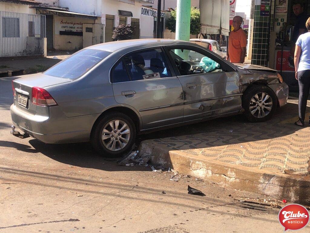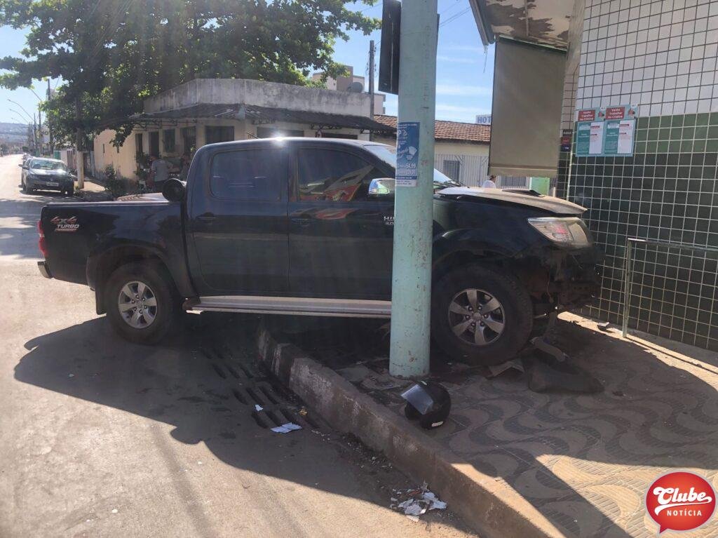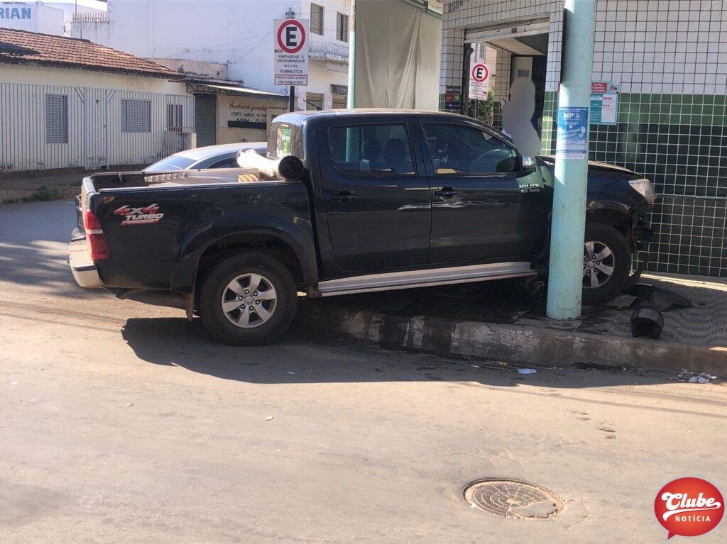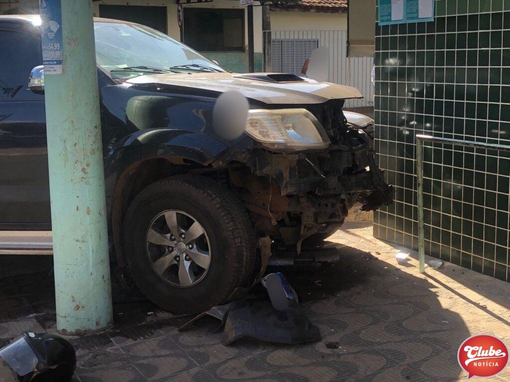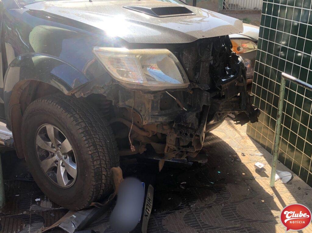 O carro foi atingido na lateral pela caminhonete Toyota/Hilux. Após o impacto, os dois veículos subiram na calçada e por pouco não entraram dentro de uma farmácia.