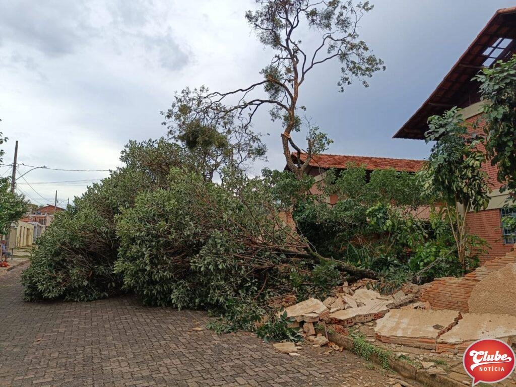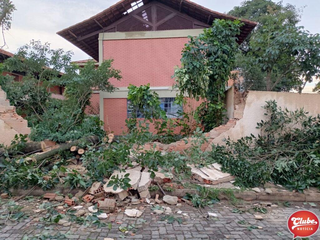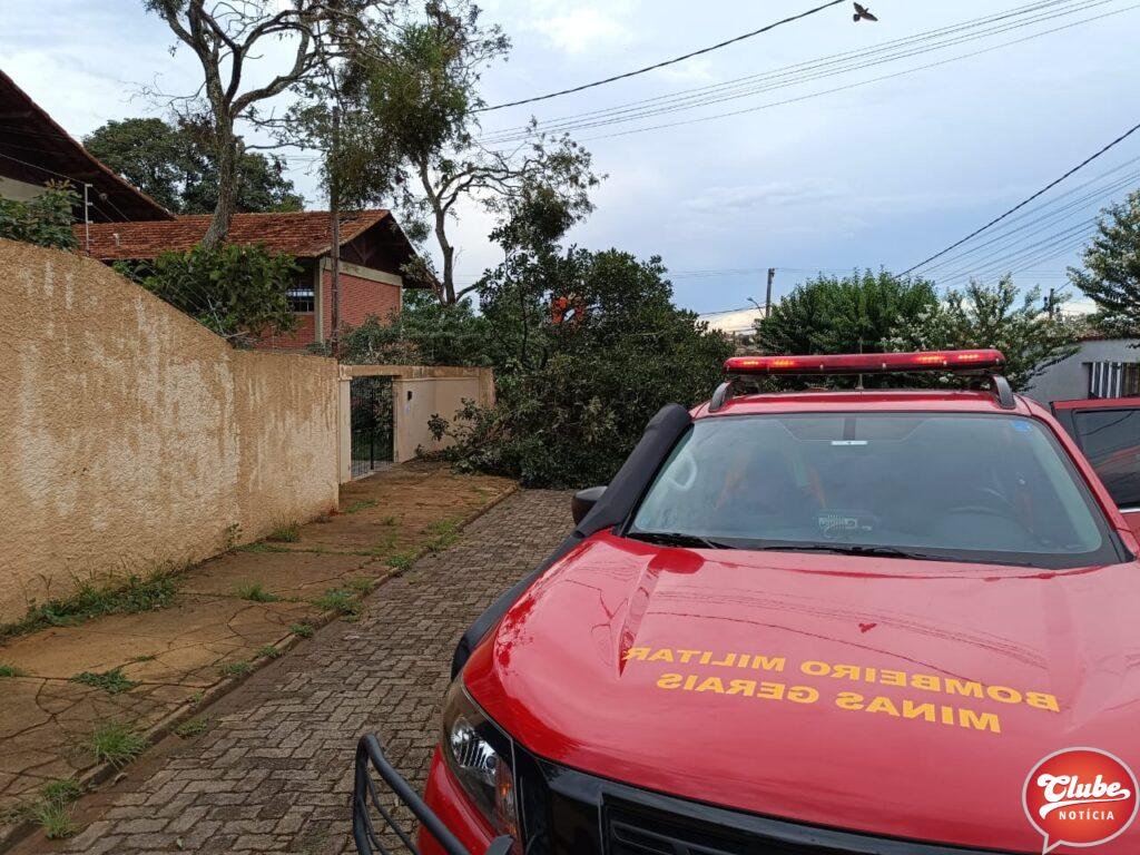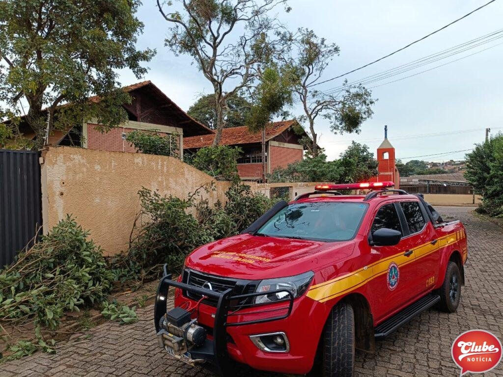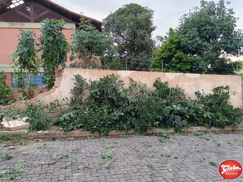 Neste sábado (06), após pancada de chuva acompanhada de rajada de ventos, o 12° Batalhão de Bombeiros Militar de Patos de Minas foram acionados para efetuar o corte de uma árvore de grande porte que caiu quebrando o muro da Escola Estadual Ilídio Caixeta e bloqueando a via de circulação.