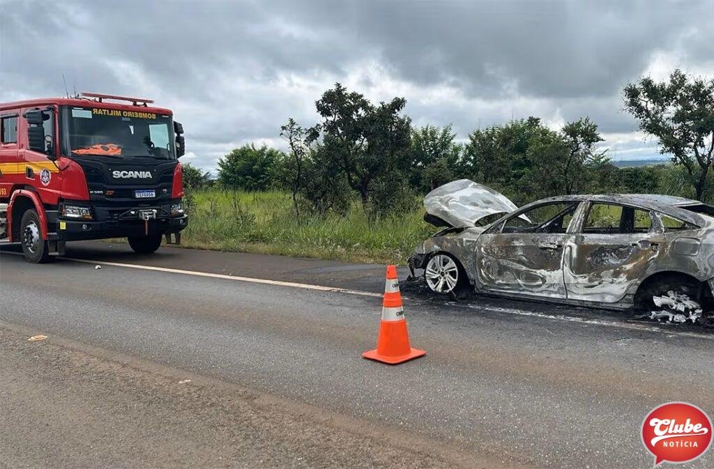 Carro fica destruído após incêndio na BR-146 em Santana de Patos