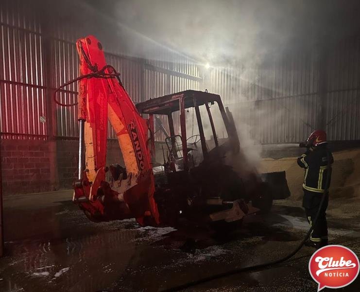 Retroescavadeira pega fogo em fábrica de rações em Patos de Minas