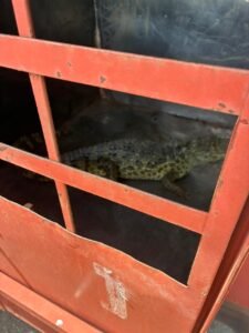 Uma guarnição de salvamento do Corpo de Bombeiros foi acionada e, ao chegar ao local, constatou que se tratava de um jacaré com aproximadamente 1,5 metro de comprimento, incluindo a cauda. Utilizando equipamentos adequados de captura e proteção individual, os militares realizaram a contenção do animal de forma segura, sem riscos à população.