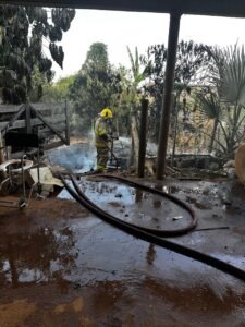 Enquanto as equipes trabalhavam, os bombeiros receberam novo chamado de incêndio em um chacreamento às margens da BR-365, próximo à comunidade do Leal, cerca de 20 km da área urbana. O fogo atingiu uma residência, destruindo dois cômodos.
