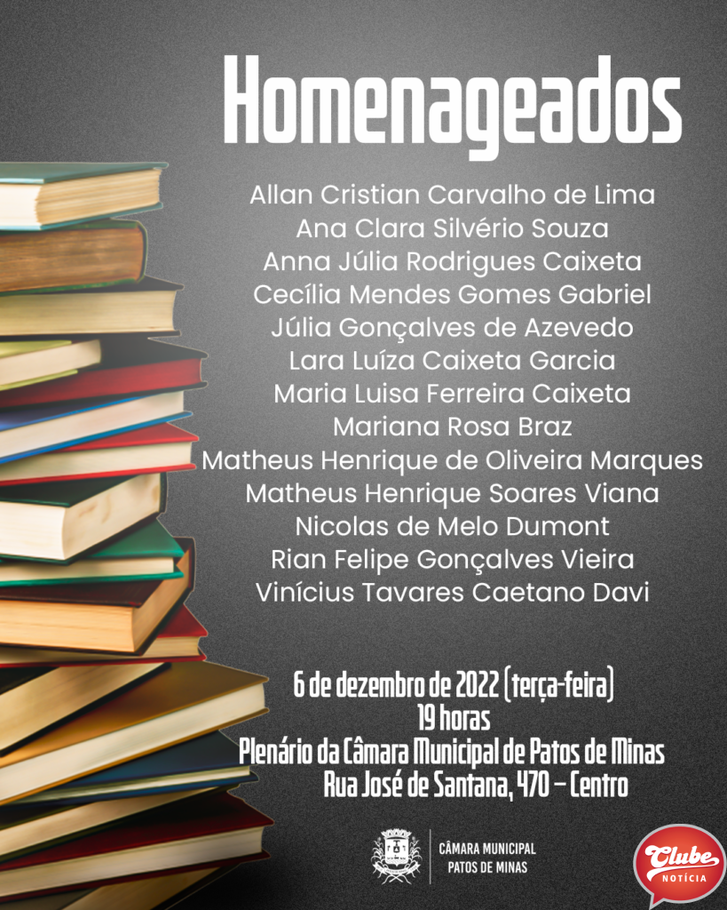 A Câmara Municipal de Patos de Minas outorga, nesta terça-feira (06/12), o diploma de Mérito Estudantil a 13 estudantes do Município que se destacaram pelo bom desempenho escolar anual e pelo envolvimento em atividades culturais, esportivas, sociais e políticas.