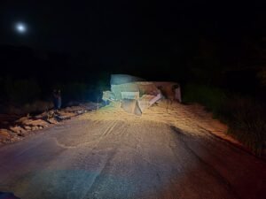 Segundo o motorista, de 56 anos, ao perceber a falha, ele estacionou o veículo e adotou os procedimentos de segurança. No entanto, a combinação acabou se deslocando para trás, provocando o chamado efeito “canivete”. Com isso, o último semirreboque tombou, espalhando grande parte da carga sobre a pista. O primeiro semirreboque também foi danificado, com perda parcial da carga. Apesar do impacto, o condutor não sofreu ferimentos.