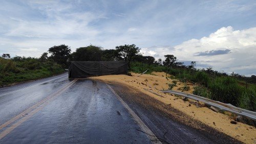 Um tombamento de um semi-reboque carregado com soja foi registrado na manhã desta sexta-feira (02/01) na BR-352, em Patos de Minas. O acidente ocorreu por volta das 7h15, no km 182 da rodovia, quando o último compartimento da combinação veicular de carga tombou após deslizar na pista molhada.