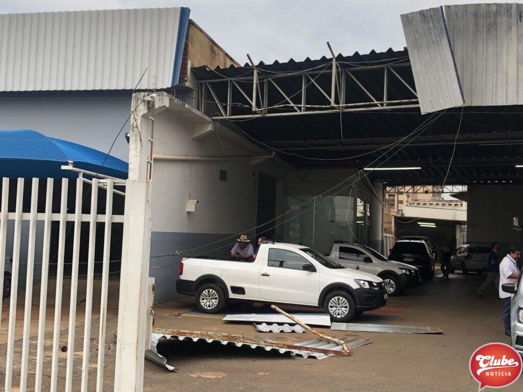 Além de puxar vários fios elétricos, uma estrutura metálica localizada em uma concessionária também foi derrubada, caindo em cima de um veículo que estava estacionado no local.