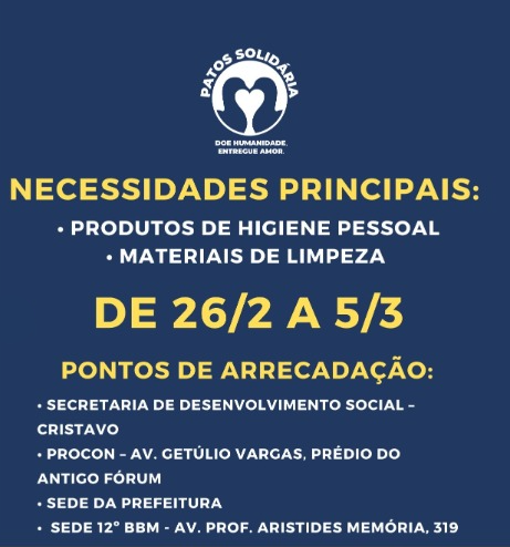 Estão sendo arrecadados exclusivamente produtos de higiene pessoal e materiais de limpeza, considerados fundamentais neste momento de reconstrução. As doações podem ser feitas até o dia 5 de março em pontos estratégicos da cidade, como: