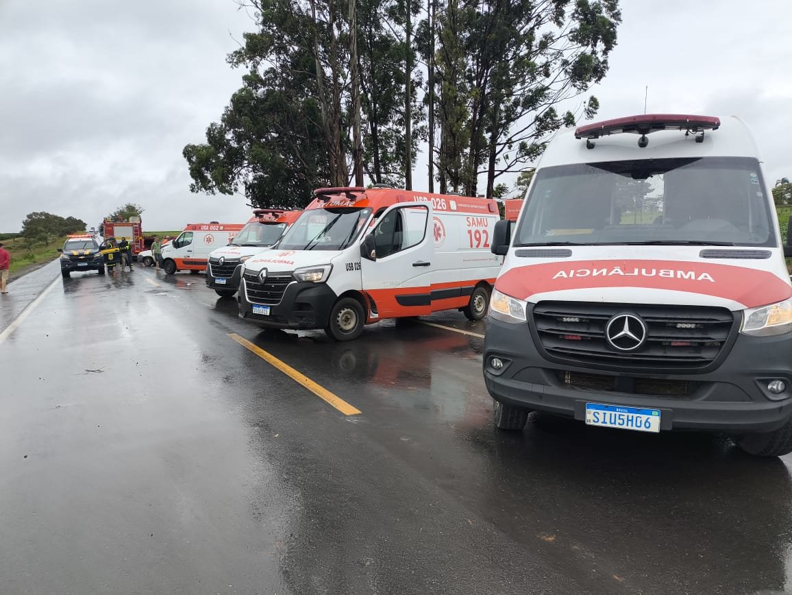 Equipes do Corpo de Bombeiros Militar de Minas Gerais, da PRF e do Serviço de Atendimento Móvel de Urgência (SAMU) estão no local para atendimento das vítimas, resgate e controle do trânsito.