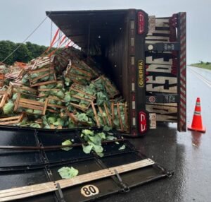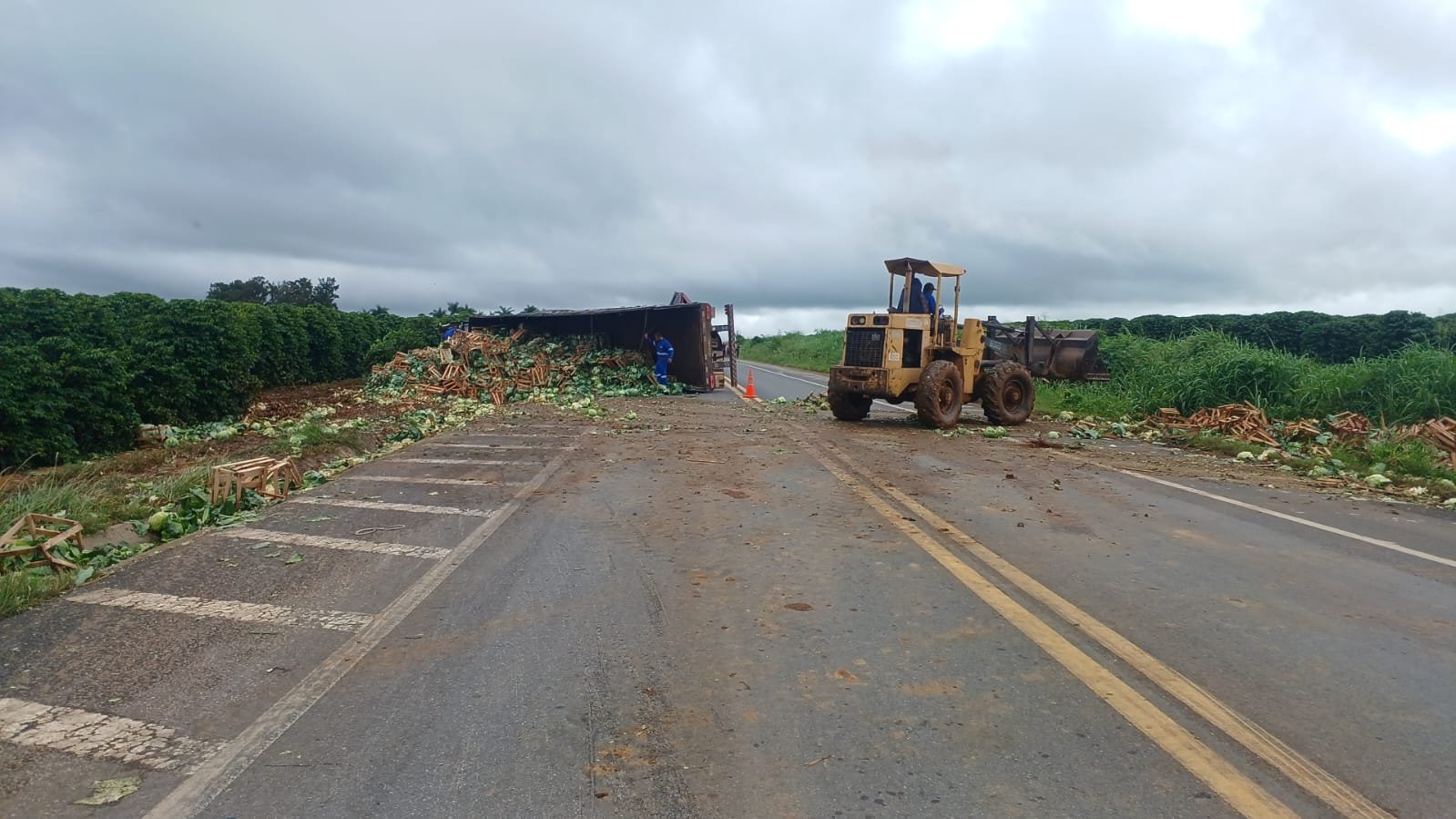 Após acionamento, a Polícia Militar Rodoviária (PMRv) compareceu ao local e constatou que uma carreta Scania, com placas do Paraguai, havia tombado, ficando atravessada parcialmente sobre a pista. Com o impacto, parte da carga de repolhos ficou espalhada pela via e pelas margens da rodovia, provocando obstrução do tráfego.