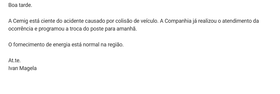 A equipe de reportagem entrou em contato com a Cemig para saber sobre os reparos e possíveis impactos no fornecimento de energia elétrica, mas até o fechamento da matéria, não houve retorno.
