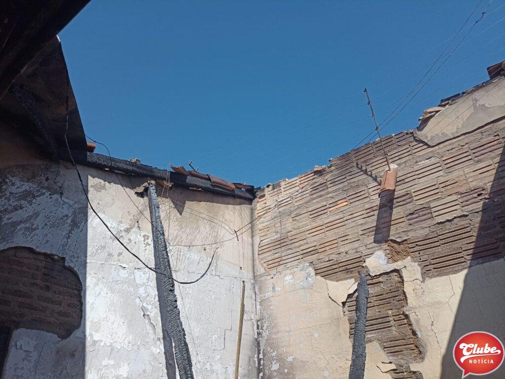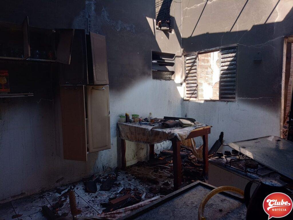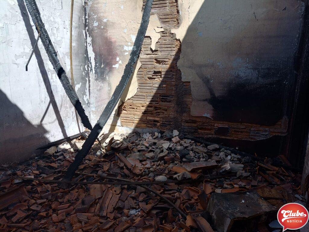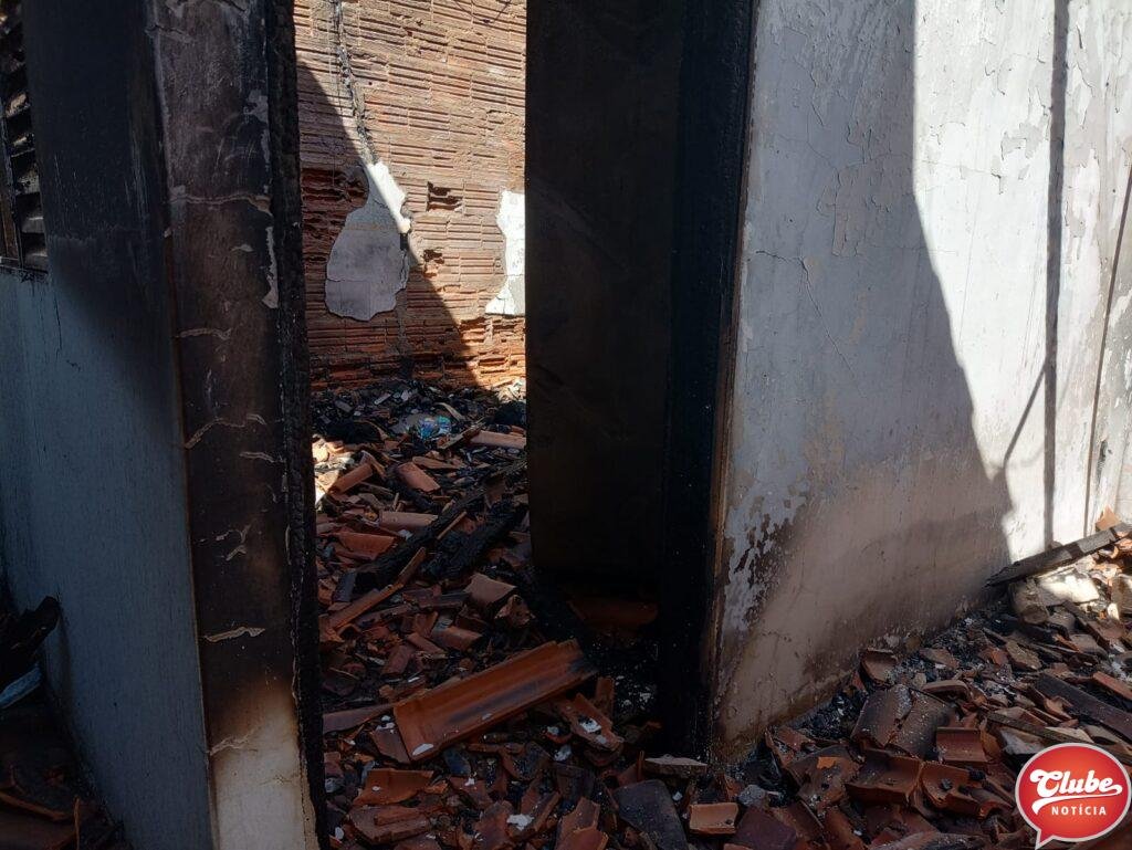 O imóvel ficou destruído. Além da estrutura da casa, o incêndio queimou os móveis, eletrodomésticos e pertences dos moradores. Até o telhado da residência desabou.