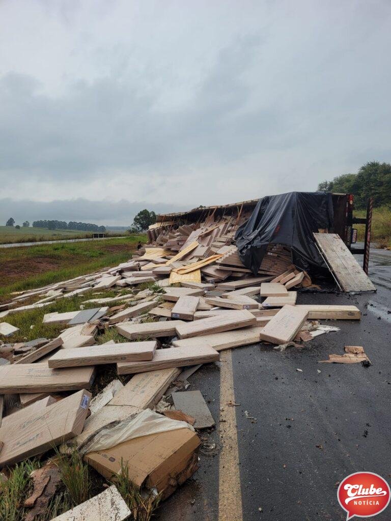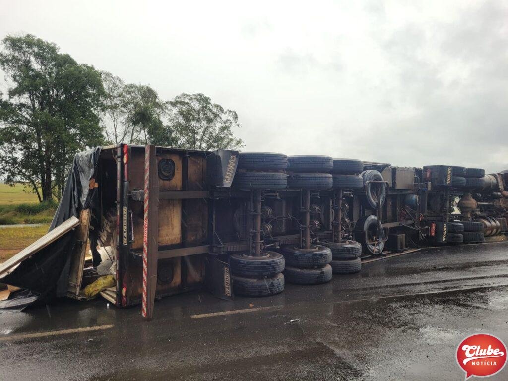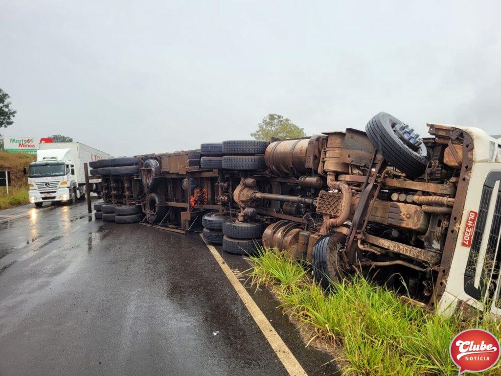 Os militares do Corpo de Bombeiros foram acionados na manhã deste domingo 15 de maio, por volta das 08 horas, para atender um tombamento de uma carreta no entroncamento do trevo da BR-365 com a MG-230.