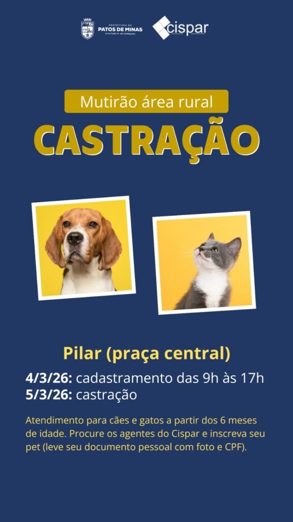 A Prefeitura de Patos de Minas, em parceria com o Cispar, vai disponibilizar o Castramóvel para a realização de mutirão de castração na área rural do município. Os próximos distritos atendidos serão Alagoas e Pilar, com datas já definidas para cadastramento e procedimentos cirúrgicos.
