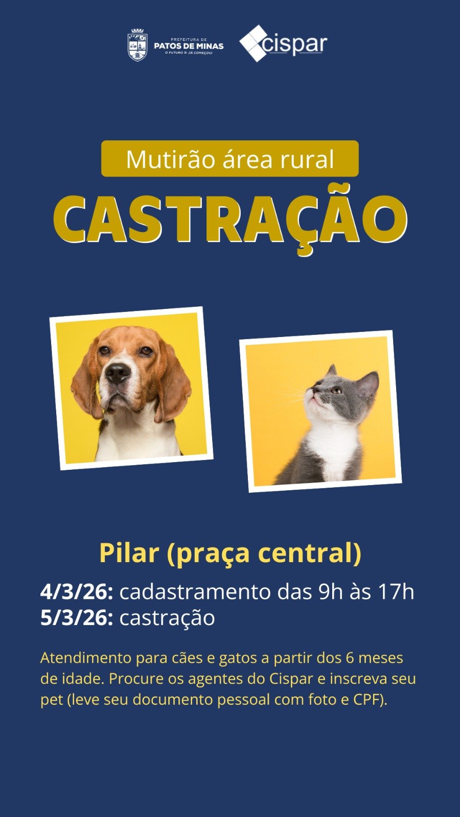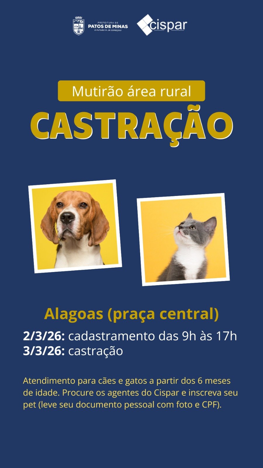 No distrito de Alagoas (praça central), o cadastramento dos animais acontece no dia 2 de março, das 9h às 17h, e as castrações serão realizadas no dia 3 de março.