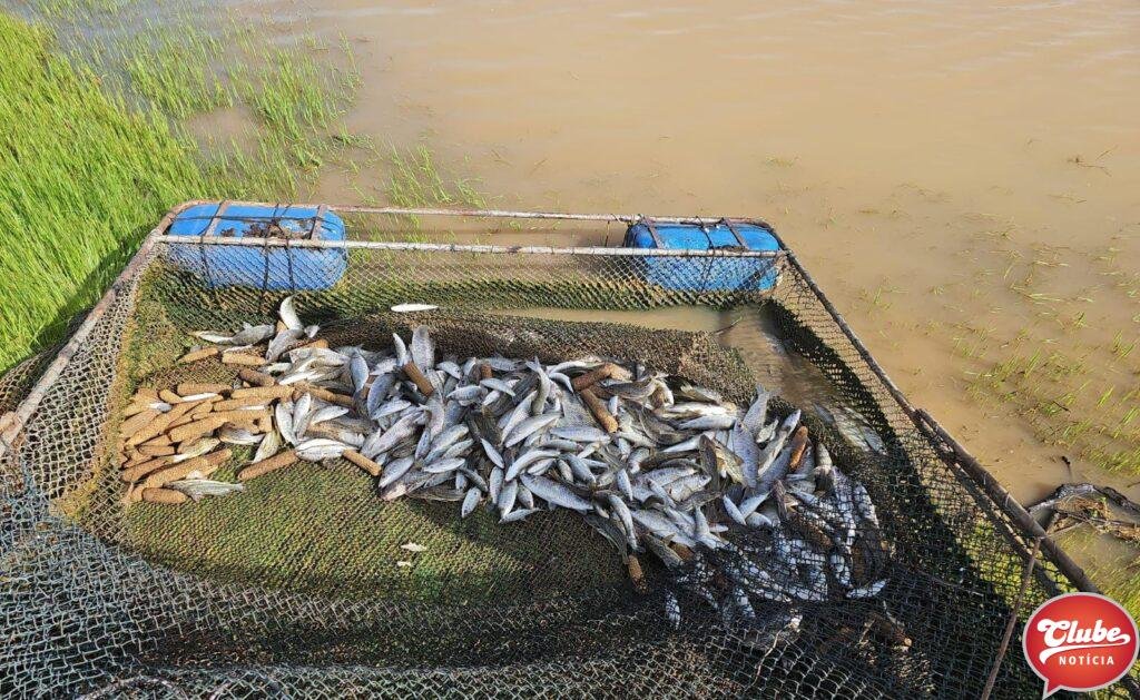 No local, os policiais verificaram que uma variedade de peixes nativos de tamanhos variados estava sendo mantida em um pequeno tanque-rede.