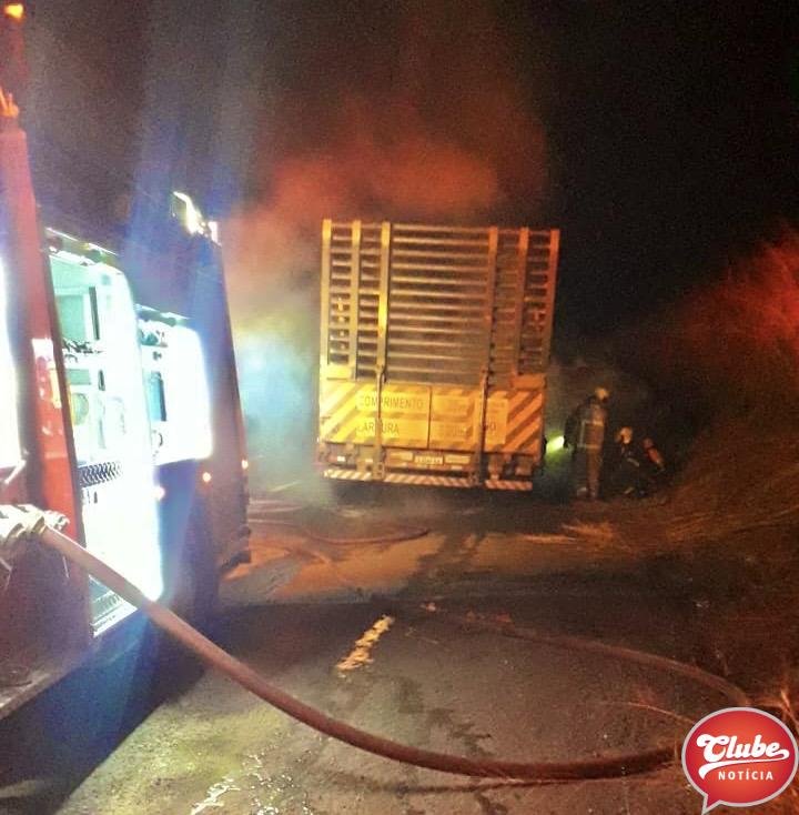 Bombeiros combatem incêndio em semirreboque de um caminhão que estava sendo transportada na BR 365