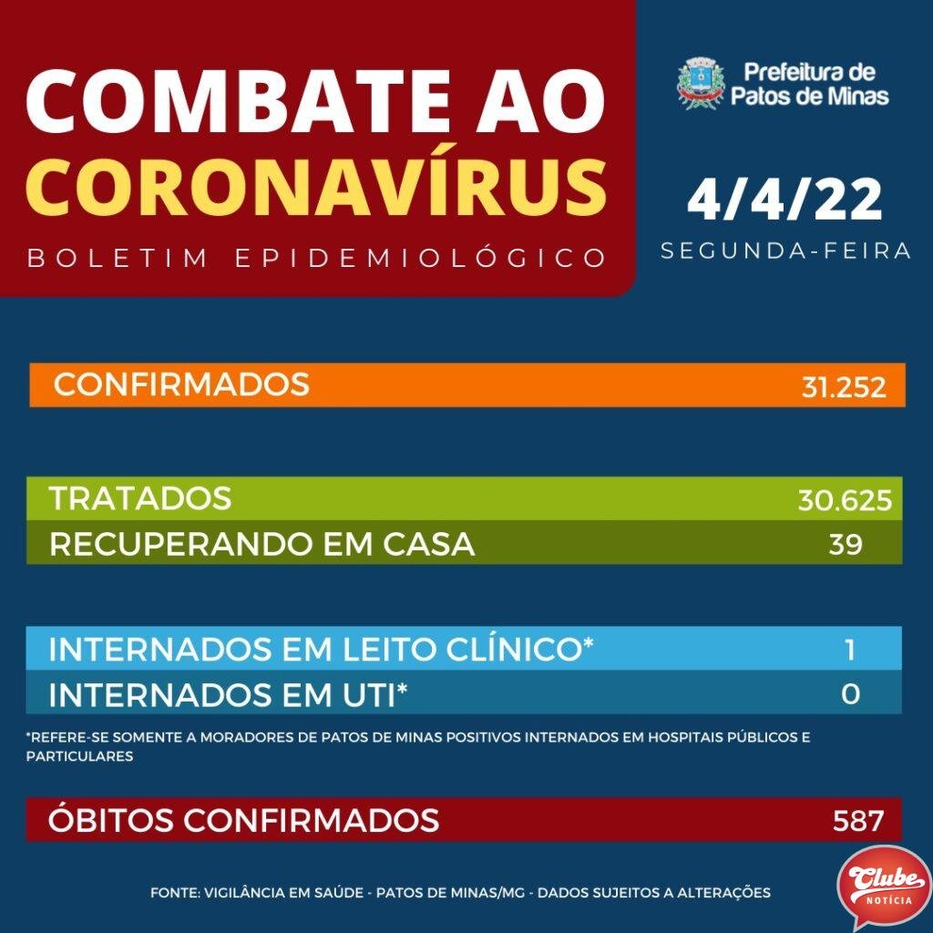 O boletim também apresenta a informação que 30.625 patenses já se recuperaram da doença, desde o início da pandemia.