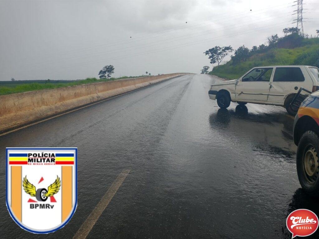 Sendo assim, a equipe policial deslocou ao local indicado onde um rapaz de 26 anos informou que conduzia o veículo Fiat/Uno no sentido Patos de Minas a Lagoa Formosa, quando o veículo aquaplanou, fazendo ele perder o controle direcional do veículo, vindo a tombar na pista de rolamento.