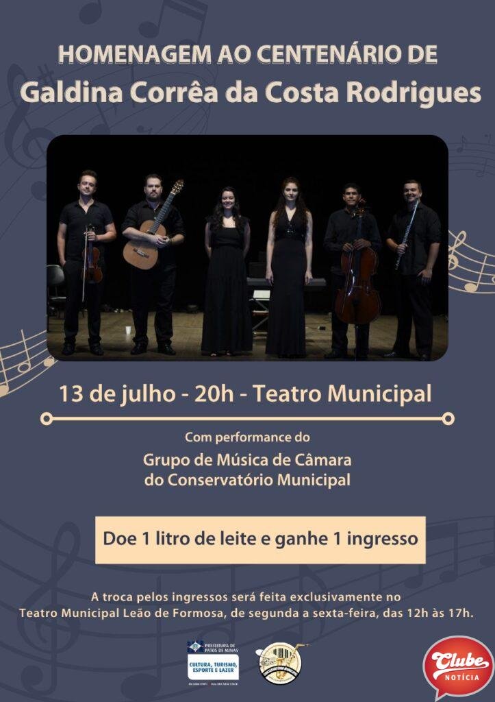 Iniciativa do Conservatório Municipal, a Homenagem ao Centenário de Galdina Corrêa da Costa Rodrigues traz Mário Reilli na direção musical e Stênio Caixeta na direção geral. A performance será dos integrantes do Grupo de Música de Câmara do Conservatório: Tiago Caixeta (violino), Holmes Molinari (flauta transversal), Raquel Lima (piano) e Mário Reilli (violoncelo). A apresentação conta com a participação de Stênio Caixeta (violão) e Márcia Soares (soprano).