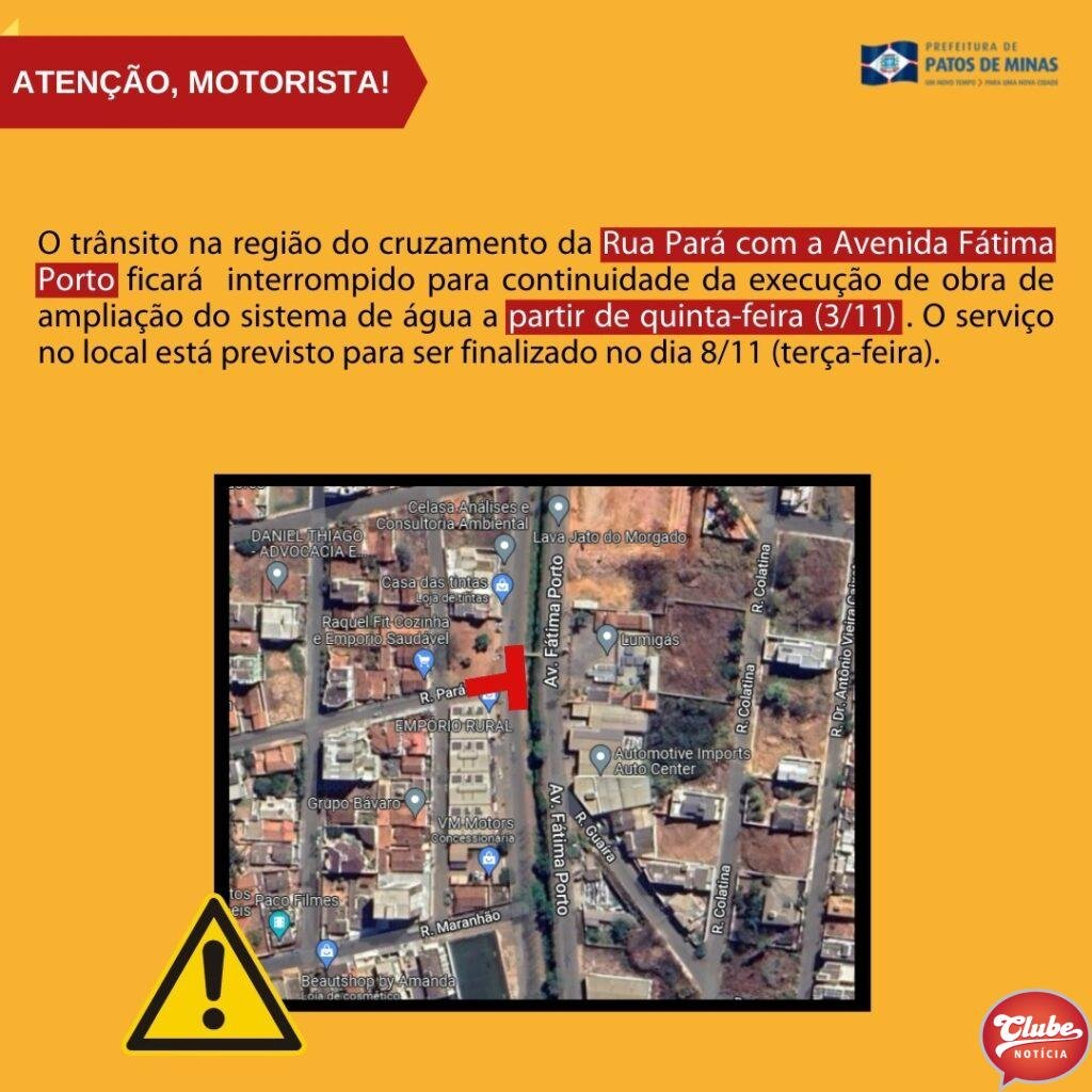 A Copasa comunicou à imprensa patense, na tarde desta terça-feira (01/11), que o trânsito da pista da avenida Fátima Porto esquina com a rua Pará, no bairro Eldorado, será interditado a partir da próxima quinta-feira (03/11). Isso será feito para dar continuidade às obras de implantação de redes de distribuição de água no local.