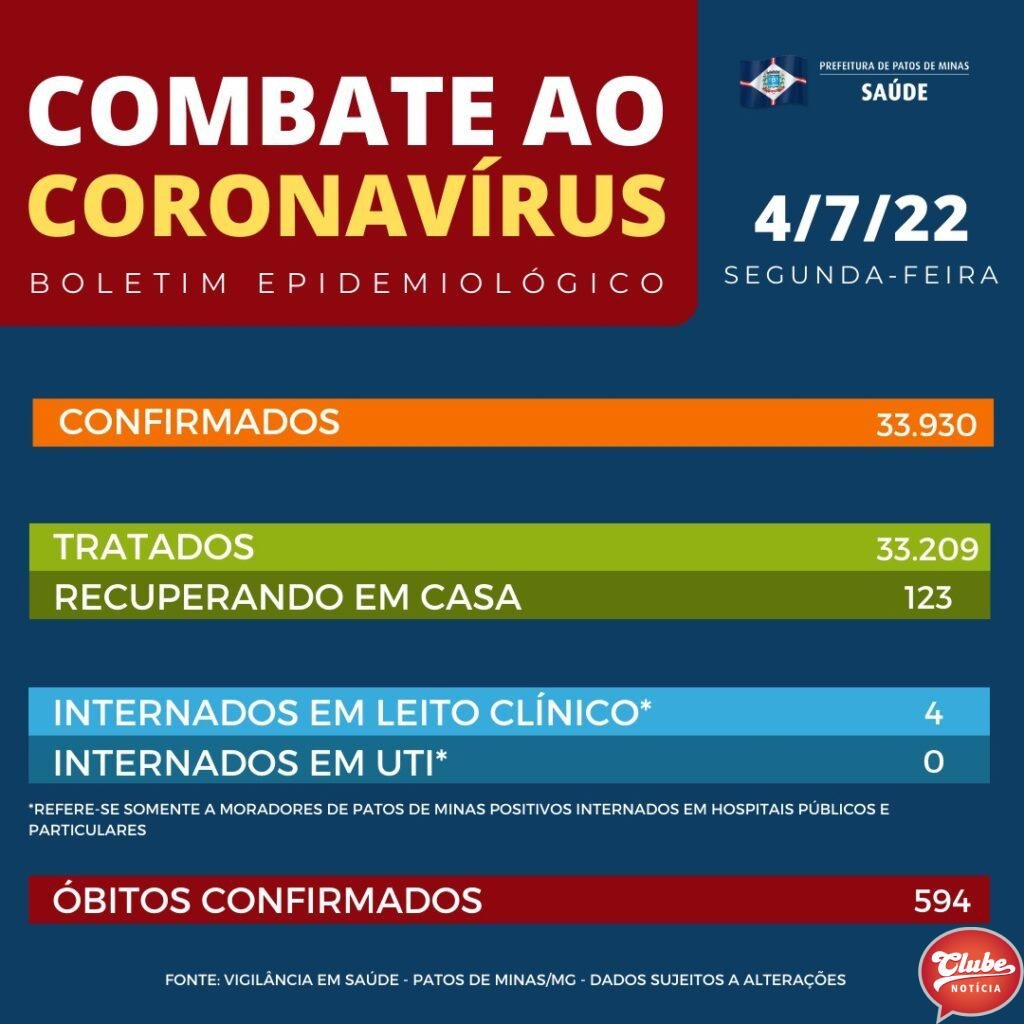 O Boletim epidemiológico divulgado nesta segunda-feira (04/7) não confirmou novos óbitos, porém, Patos de Minas já registrou 594 mortes por Covid-19. É importante ressaltar que as mortes são registradas de acordo com o município de residência, sendo assim esses óbitos anteriormente citados correspondem a pessoas que residiam em Patos de Minas.