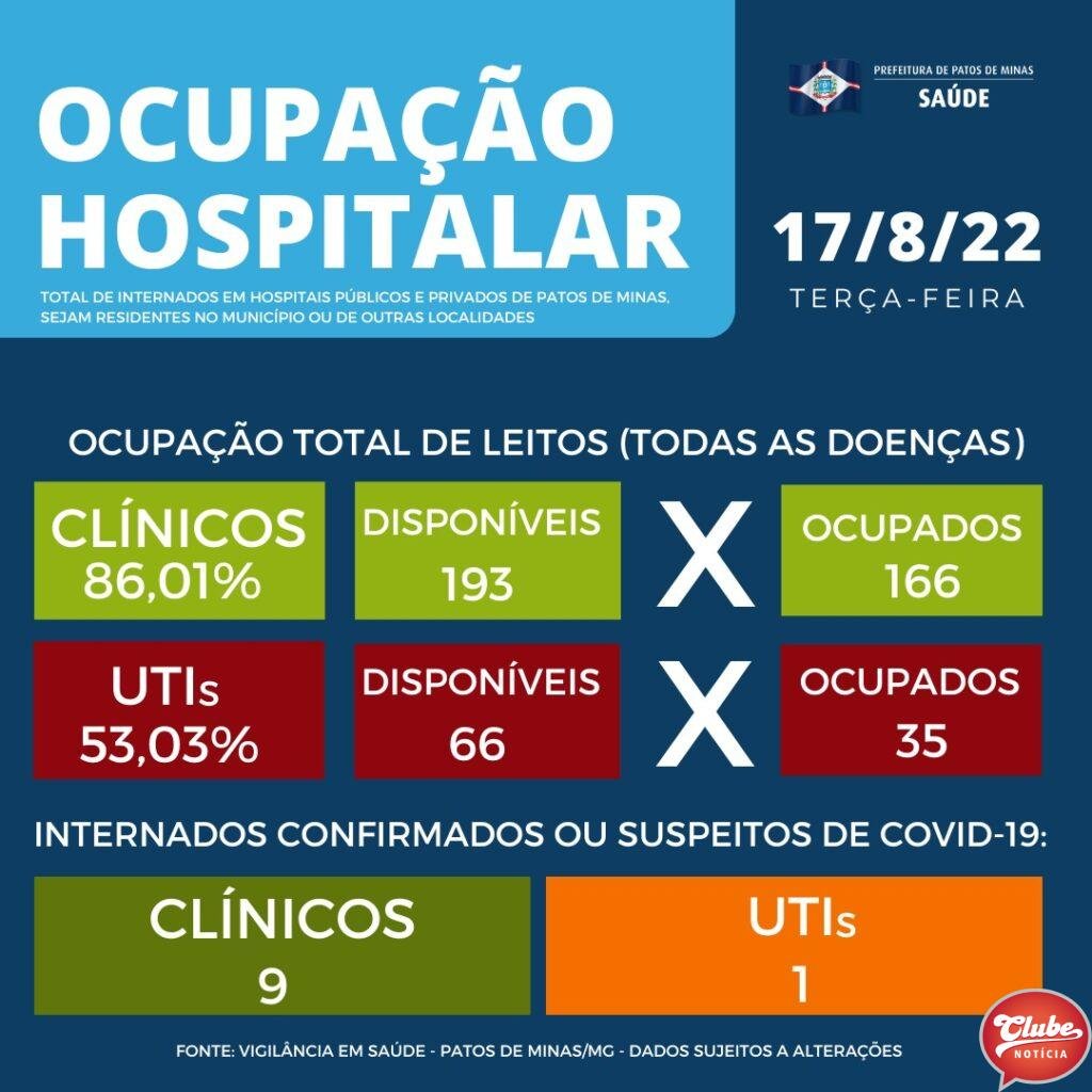 Em relação às internações, o boletim registrou dez pessoas internadas, sendo nove pacientes em leitos clínicos e um em leito de UTI. Esses números consideram pacientes residentes em Patos de Minas e também de outros municípios internados na cidade, levando em conta leitos públicos e privados.