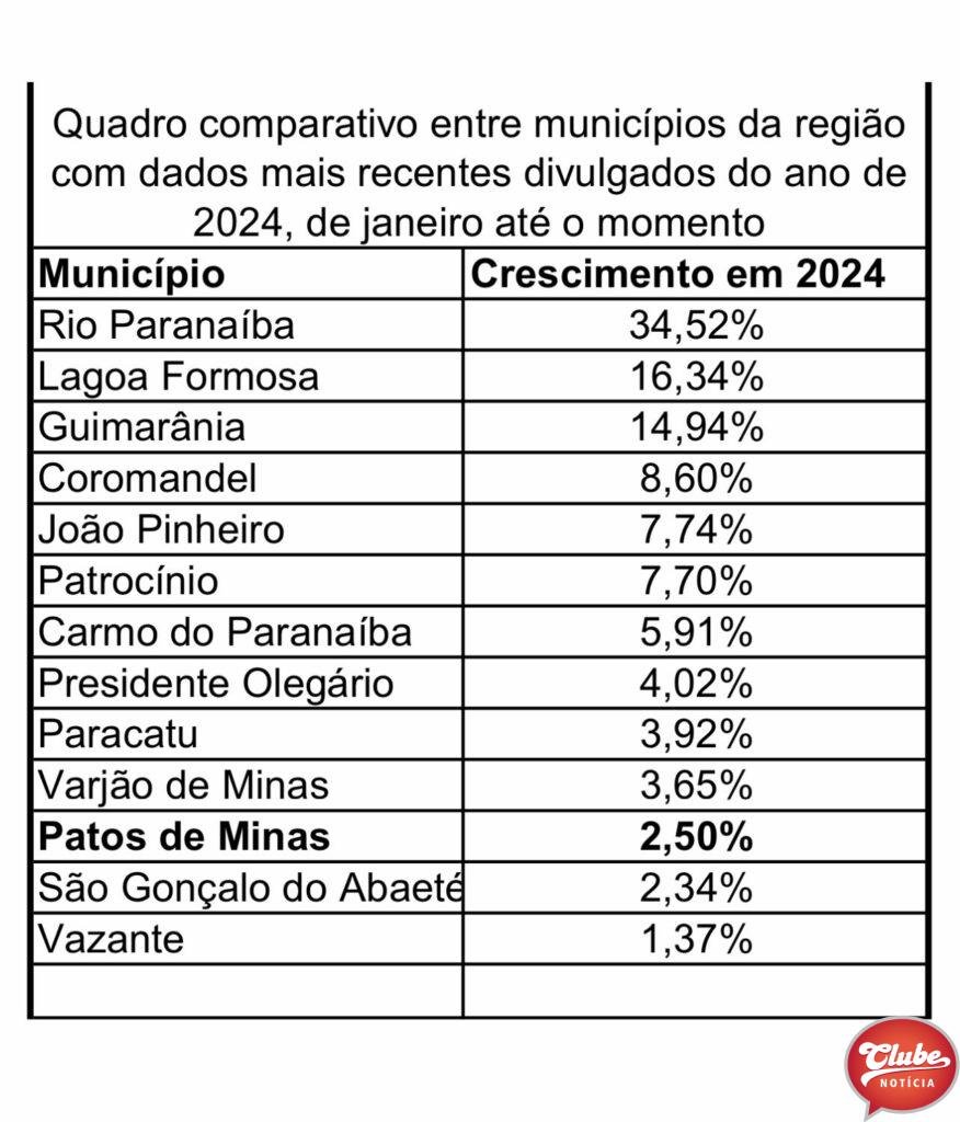 Essa não é a primeira vez que Patos de Minas fica para traz na questão de crescimento econômico. Em 2023, enquanto a cidade cresceu 2,91%, o Brasil cresceu 3,3% e Minas Gerais 2,98%.