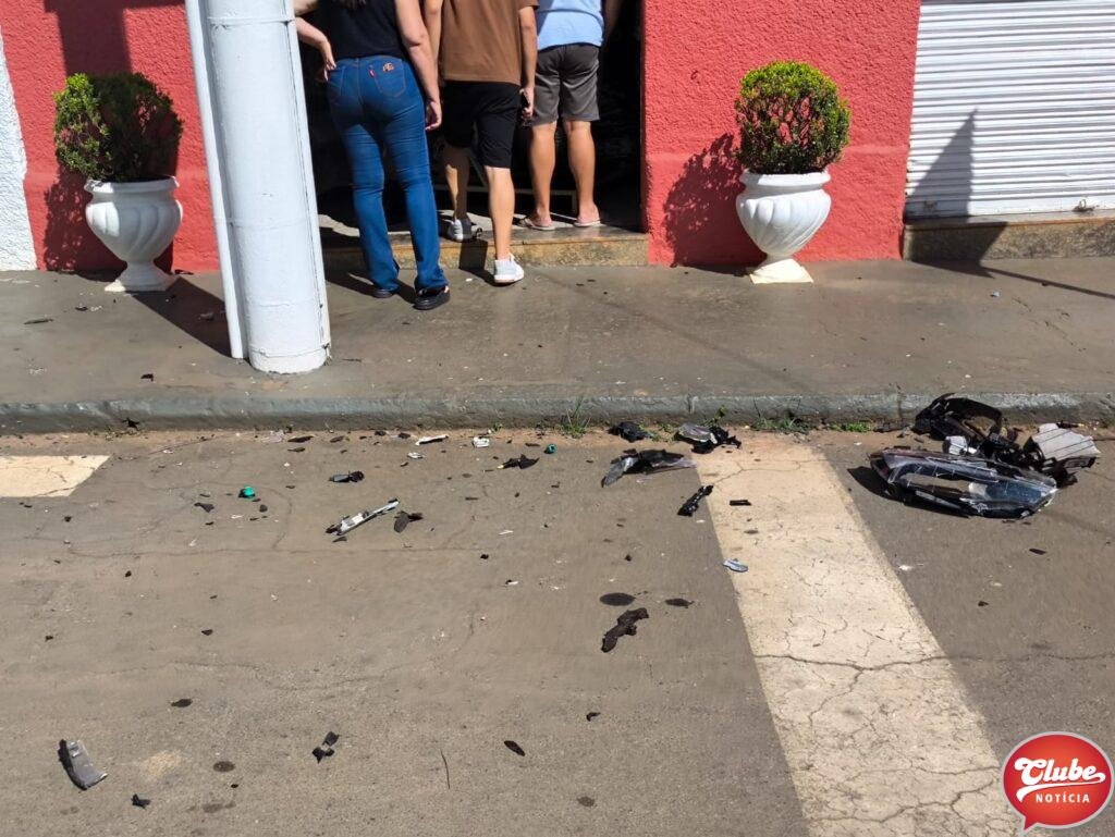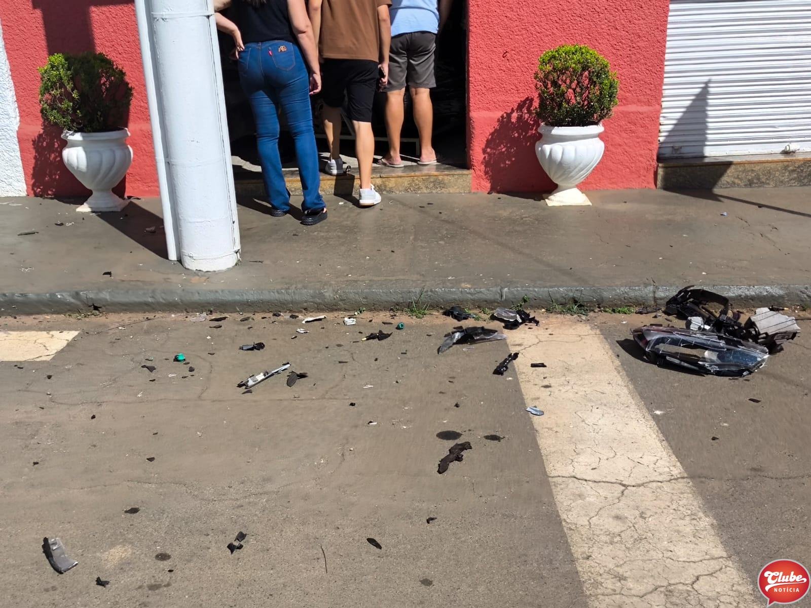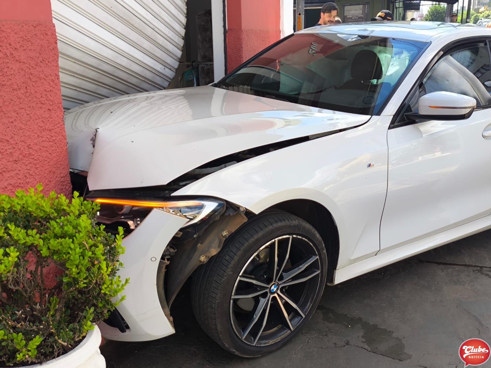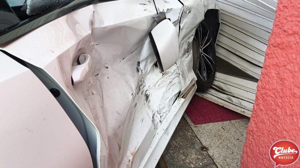 Com o impacto da colisão, o condutor da BMW perdeu o controle da direção, subiu no passeio e acabou atingindo a porta de um estabelecimento comercial. O local, identificado como Bella Casa, sofreu danos consideráveis em sua estrutura.