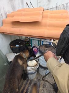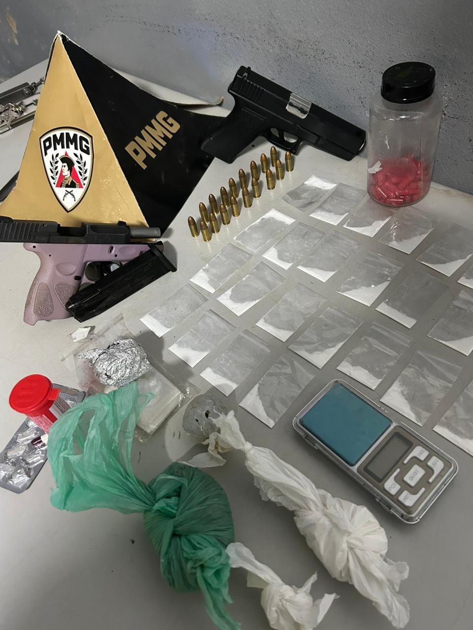 Com o apoio de equipe especializada com cães de faro, foram encontradas, na área externa do imóvel, diversas porções de substâncias semelhantes à cocaína e maconha. Também foram apreendidos materiais utilizados para o preparo e comercialização das drogas, como balança de precisão e invólucros plásticos.