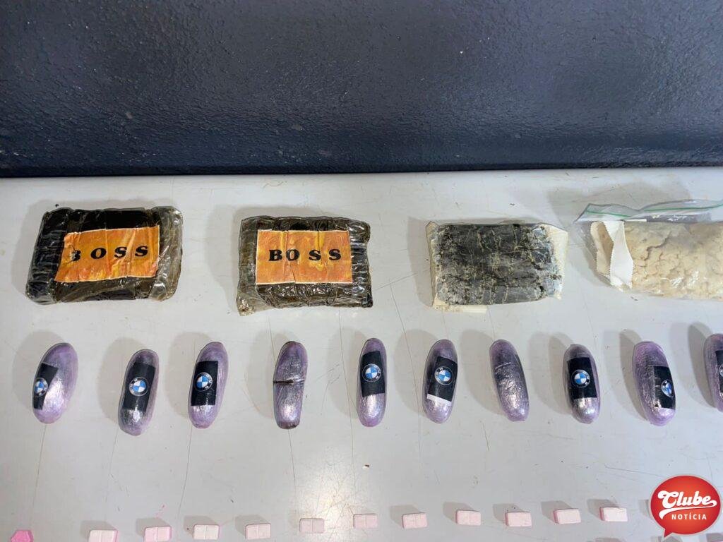Ao realizar a busca pessoal no suspeito de 23 anos, os militares verificaram que havia alguns volumes presos nas suas coxas. Questionado, o suspeito disse que o volume encontrado era drogas.