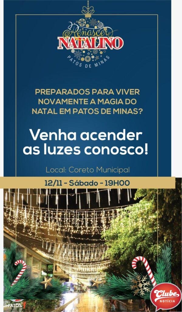 Segundo a Prefeitura de Patos de Minas, as luzes do Renascer Natalino, serão acesas pela primeira vez em 2022, no sábado (12/11) às 19 horas. A cerimônia de Abertura está prevista para acontecer no Coreto Municipal.