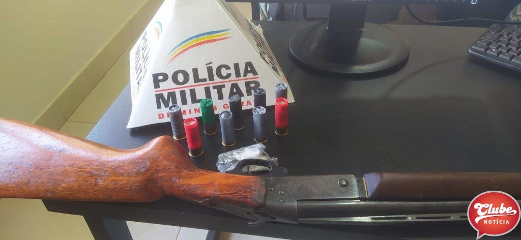 Durante as buscas, foram encontradas uma espingarda escopeta calibre 12, sem registro, e várias munições e porções de maconha.
