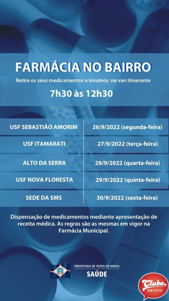 O objetivo é que os moradores dos bairros e de localidades próximas possam retirar remédios e insumos prescritos pelo médico. É importante ressaltar que as regras para dispensação de medicamentos são as mesmas em vigor na Farmácia Municipal, ou seja, apenas mediante apresentação de receita.