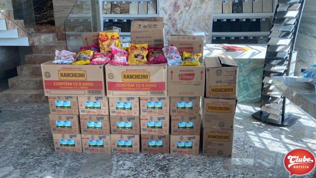 No total foram 360 litros de leite, 105 pacotes de bolacha do tipo rosquinha de coco, 100 pacotes de bolacha recheada e mais chocolates, balas e doces