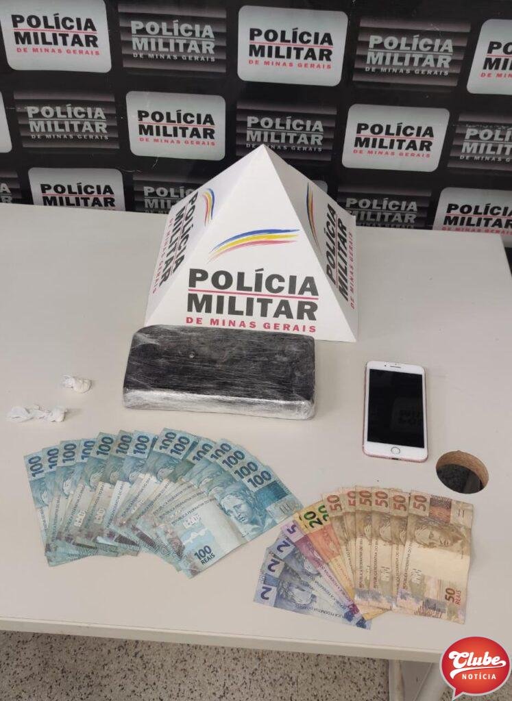 Durante abordagem, foi feita busca pessoal no suspeito sendo localizado consigo, dentro dos calçados, dois papelotes de substância semelhante a cocaína, dinheiro e um aparelho celular.