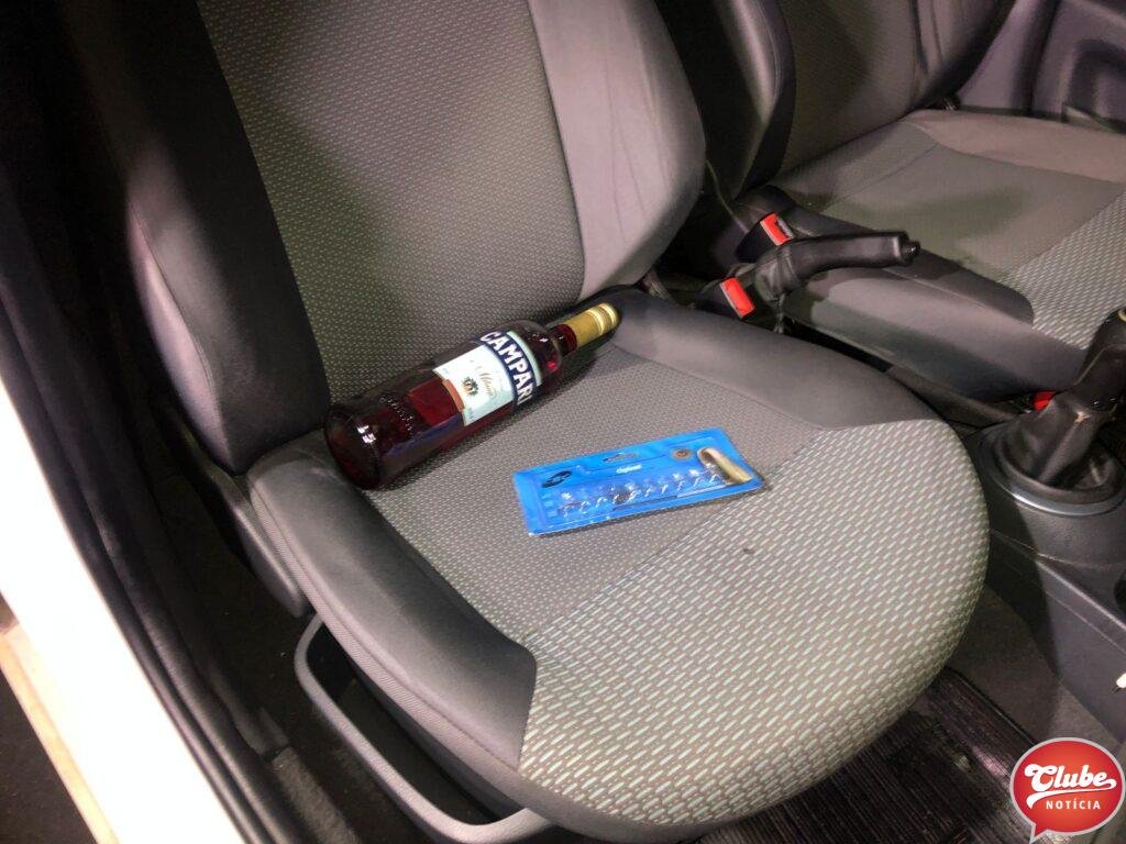 Dentro do carro, os policiais encontraram uma embalagem de munições de pistola 765 e uma garrafa de Campari.