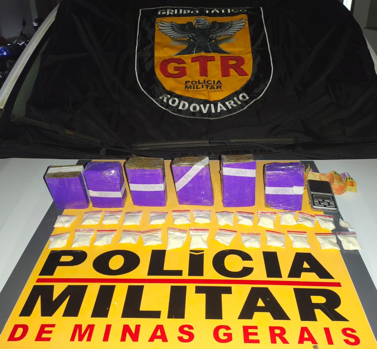 O homem viajava em um ônibus M. Benz/MPolo Paradiso R quando demonstrou nervosismo durante a abordagem policial, o que chamou a atenção da equipe. Diante da atitude suspeita, os militares realizaram vistoria na bagagem do passageiro, encontrando dentro de uma bolsa: seis barras de maconha já cortadas e fracionadas, 27 papelotes de cocaína, uma balança de precisão e R$ 45,00 em dinheiro.