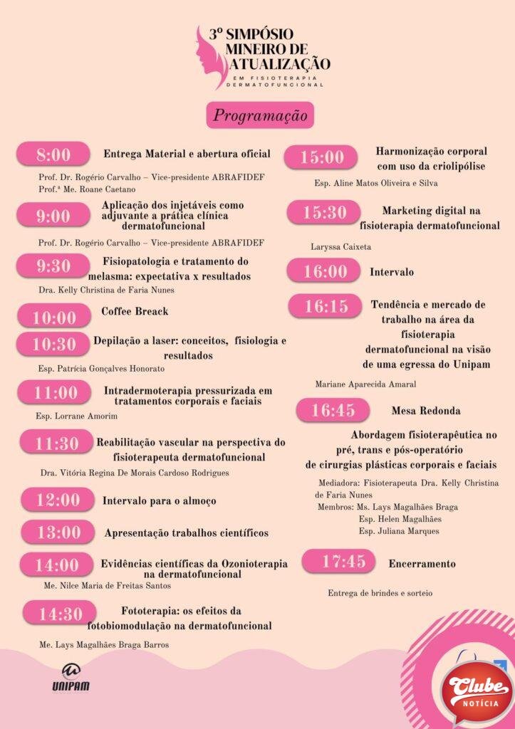 A Liga Acadêmica de Fisioterapia na Saúde da Mulher e Dermatofuncional (LAFISMD), do Centro Universitário de Patos de Minas (UNIPAM), promove, no próximo sábado (03/09), o “III Simpósio Mineiro de Atualização em Fisioterapia Dermatofuncional”. O evento acontece no auditório do bloco N, a partir das 8h. A LAFISMD é coordenada pelas professoras Kelly Christina de Faria Nunes e Lays Magalhães Braga Barros.