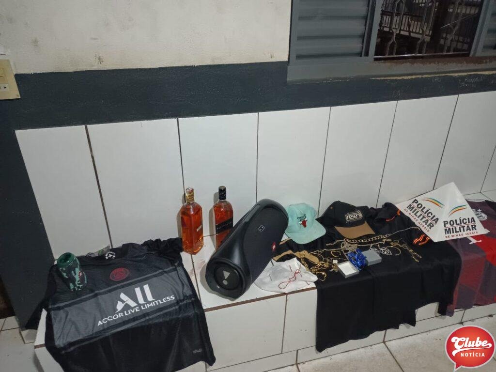 Com o suspeito, os policiais encontraram duas garrafas de uísque, duas caixas de som, joias, bijuterias, roupas e dois bonés.