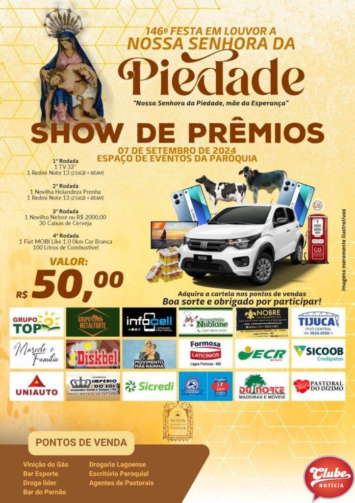 Além disso, no dia 7 de setembro será realizado o show de prêmios, onde será sorteado um carro Fiat/Mobi zero km. Os interessados em adquirirem as cartelas para concorrerem aos sorteios dos prêmios, entre eles o automóvel zero kilometros, podem solicitá-las via whatsapp.