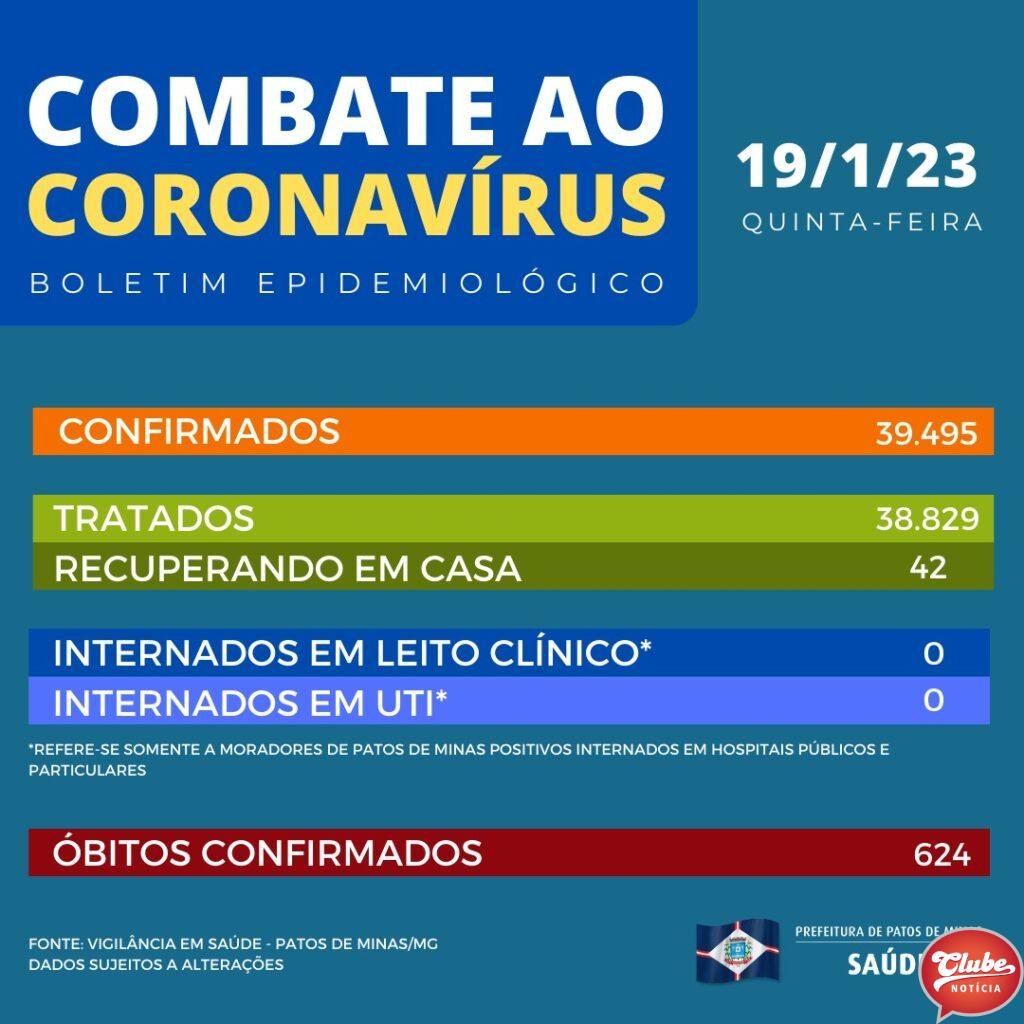 A Secretaria Municipal de Saúde (SMS) divulgou, nesta quinta-feira (19/01), que Patos de Minas, atualmente, tem 42 casos ativos de Covid-19. Segundo o boletim atual nenhum patense enfrenta a doença internado.