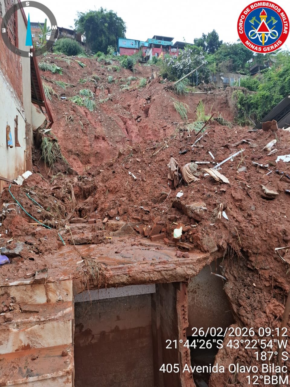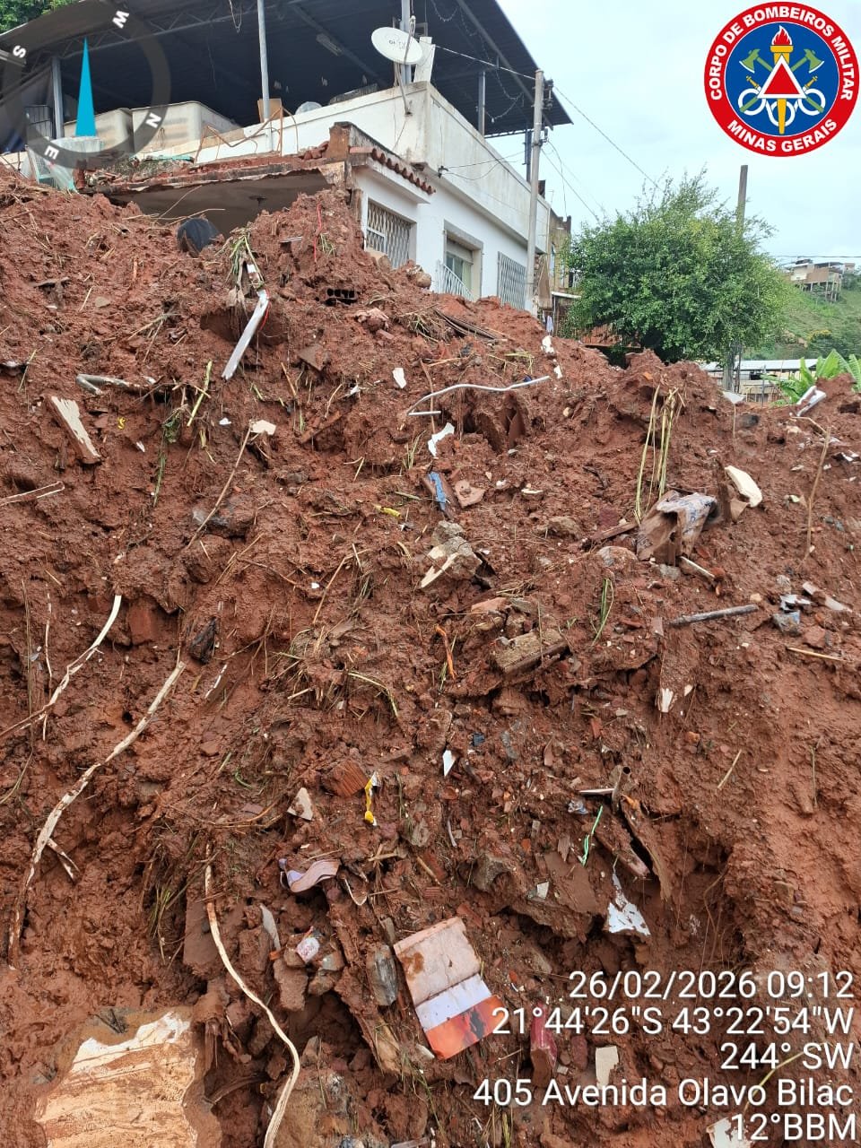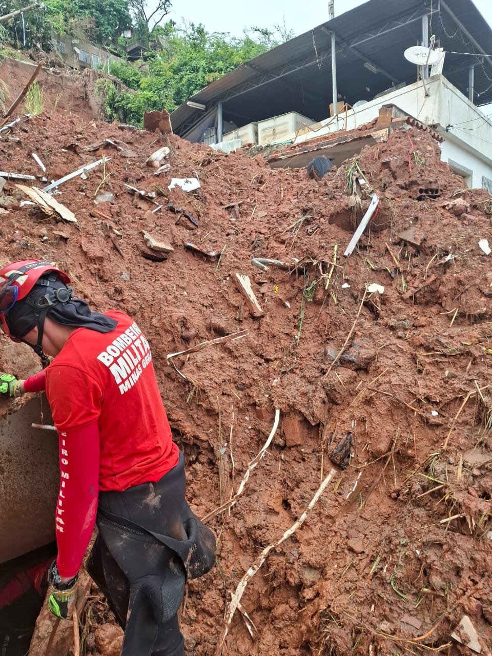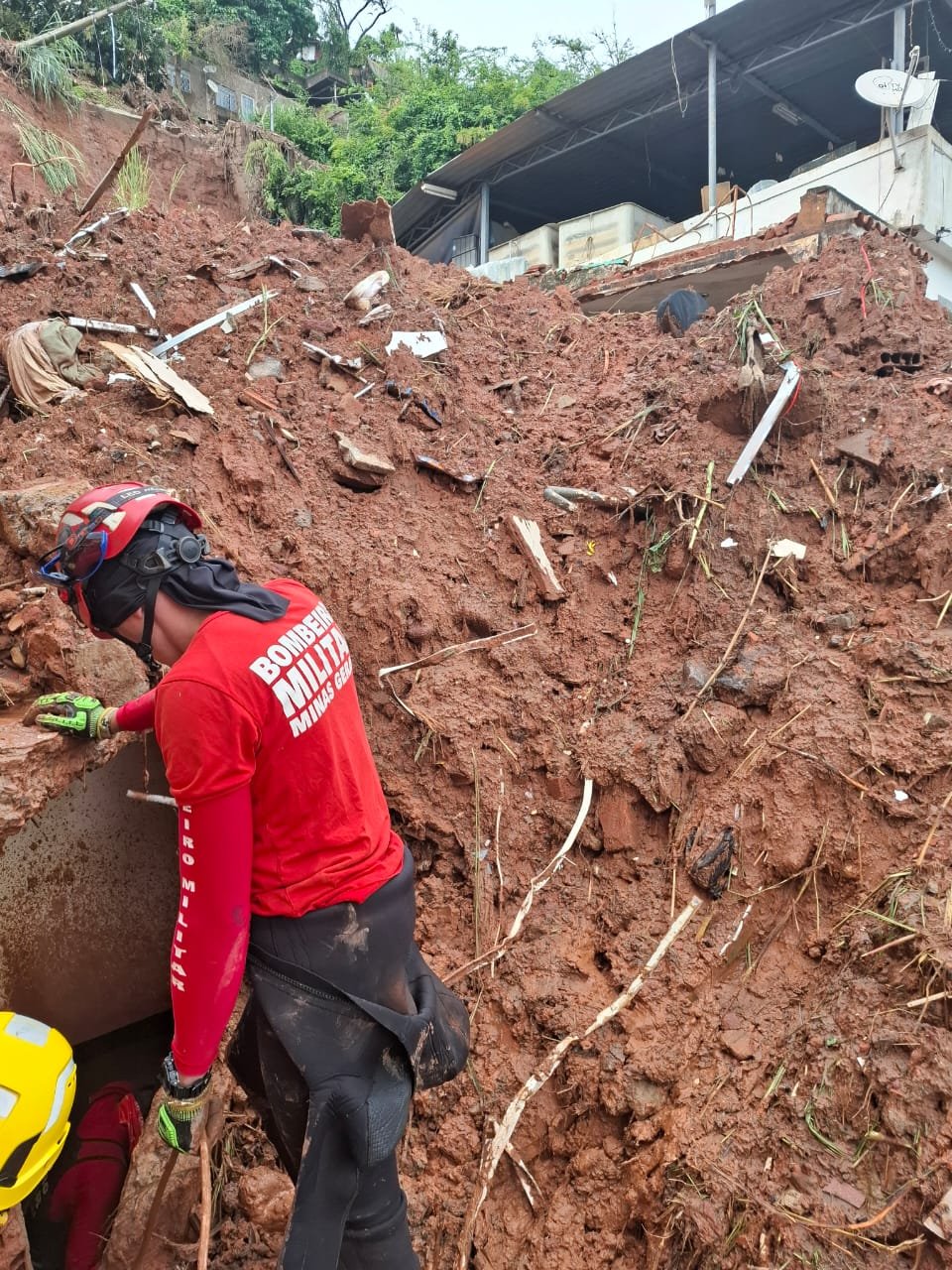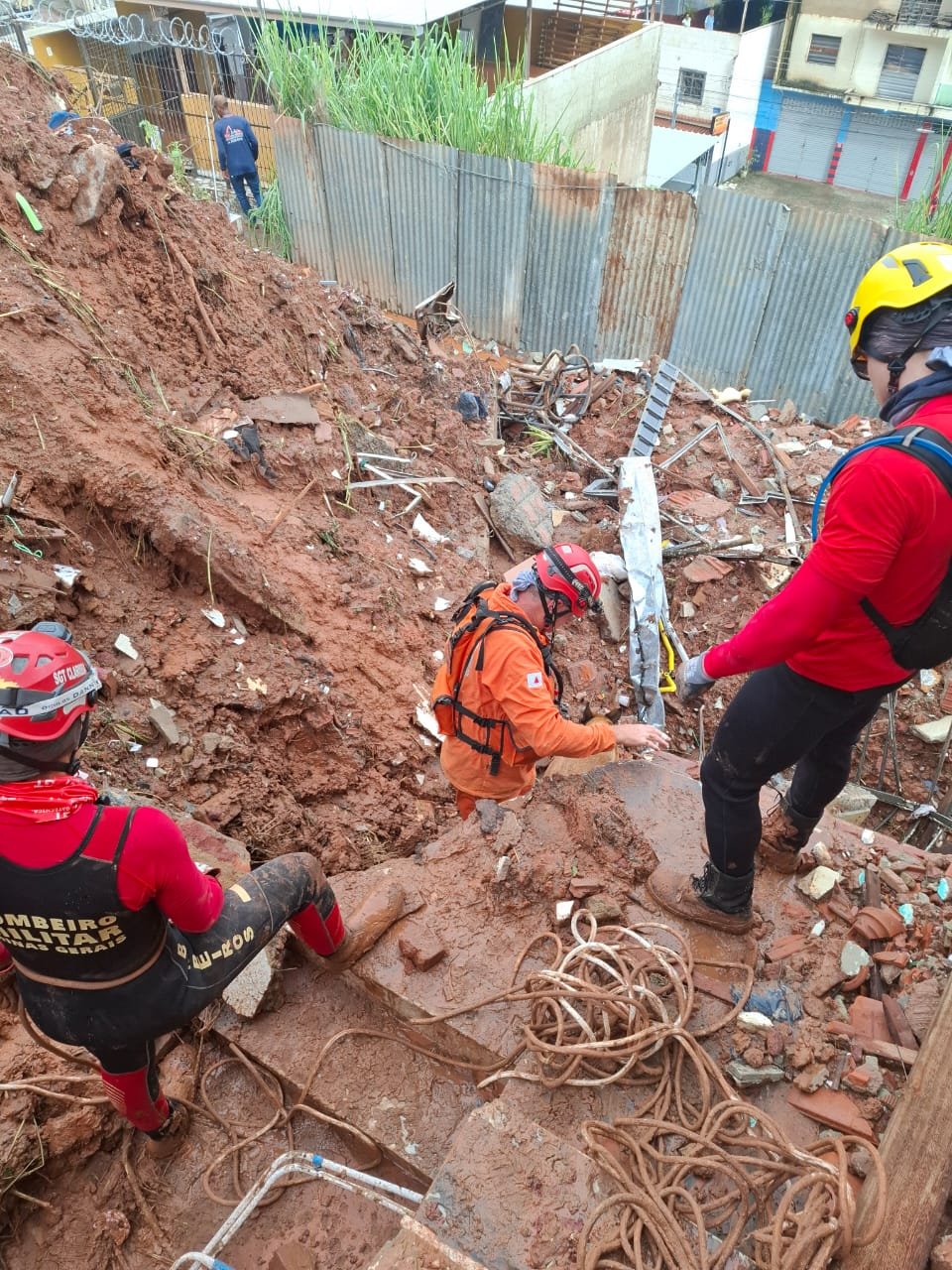 Militares do 12º Batalhão de Bombeiros Militar seguem atuando de forma intensa no bairro Esplanada, em Juiz de Fora, onde uma casa de três pavimentos cedeu, deixando cinco pessoas de uma mesma família soterradas.