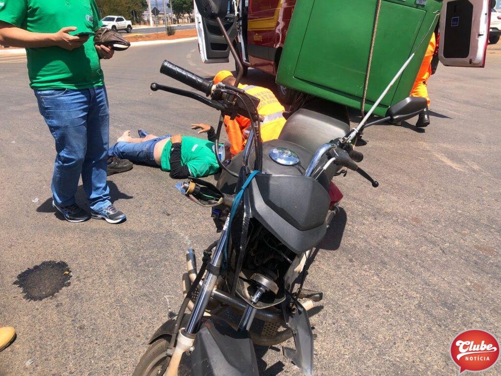 O motociclista perdeu o controle e caiu. Não há informação se ele teria atingido o carro.