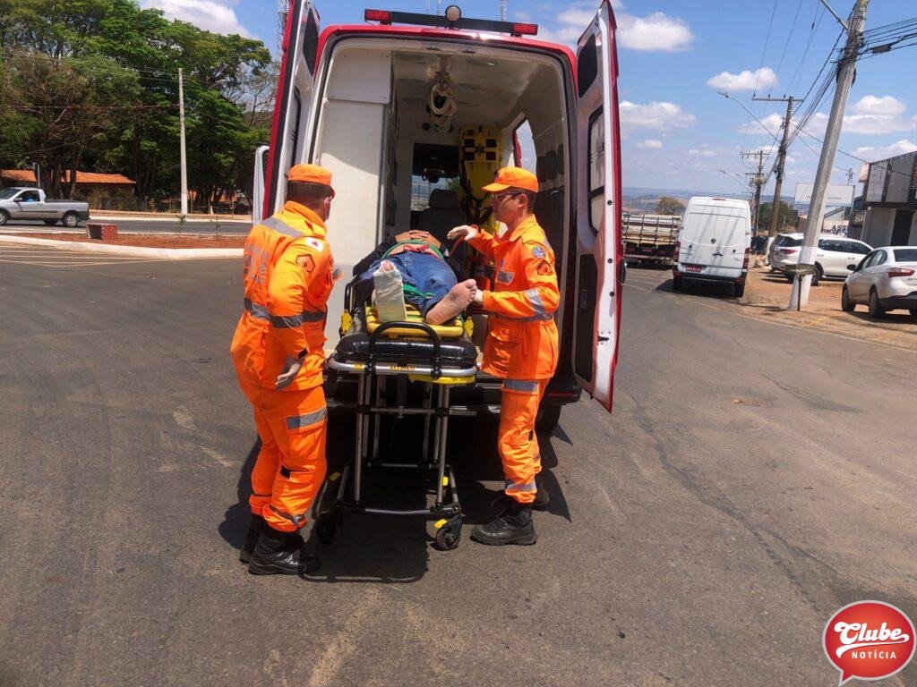 O condutor da moto foi socorrido pelo Corpo de Bombeiros com suspeita de fratura no tornozelo direito e levado para a Santa Casa de Misericórdia de Patos de Minas.